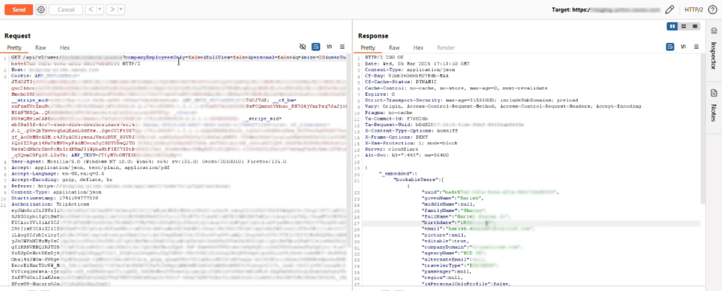 • After logging into the target website using my first account, we intercepted all network requests using Burp Suite.