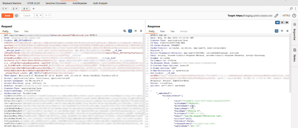 • We identified a request containing a parameter (q) that seemed to be linked to the account information.